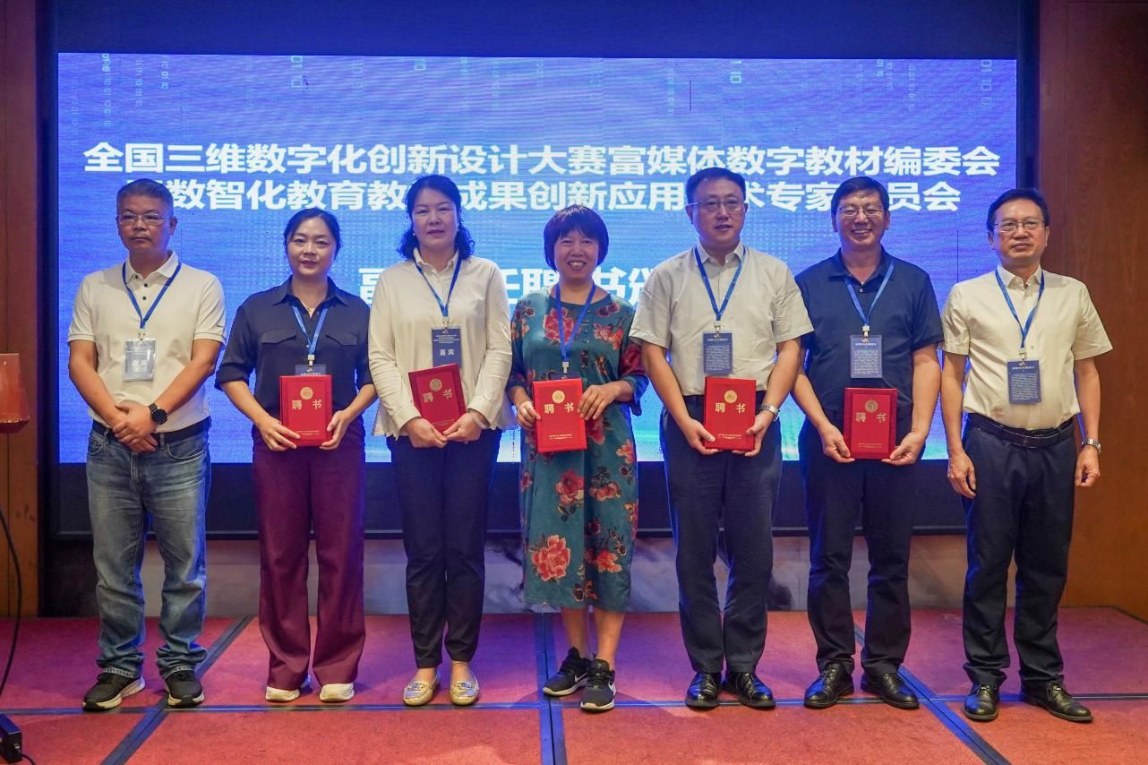 会议首先举行了全国三维数字化创新设计大赛富媒体数字教材编委会暨数智化教育教学成果创新应用技术专家委员会的成立仪式。湖南工程学院党委委员、副校长罗毅平和全国3D大赛组委会副秘书长、3D动力常务副总裁刘晓青为当选的副主任委员颁发了聘书。